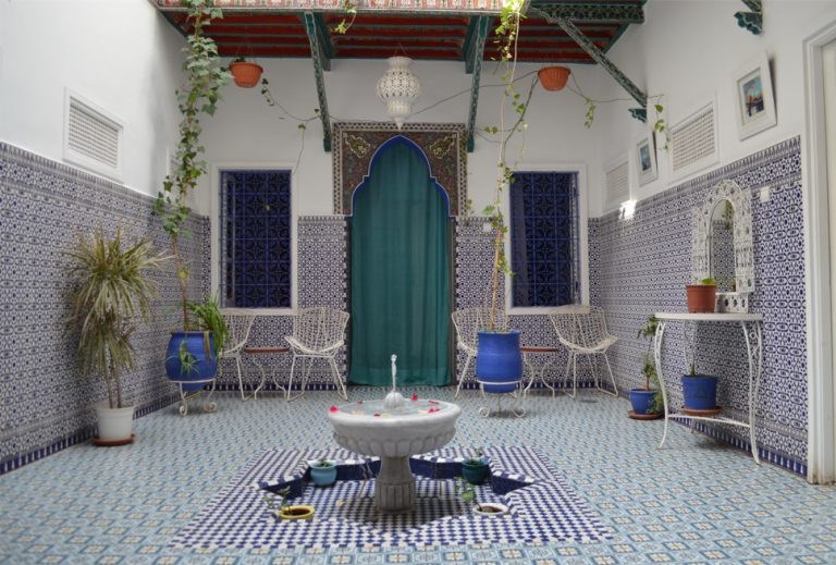 Chambres et suites s’articulent autour d’un beau patio avec au milieu une fontaine en marbres et Zelligs traditionnels .