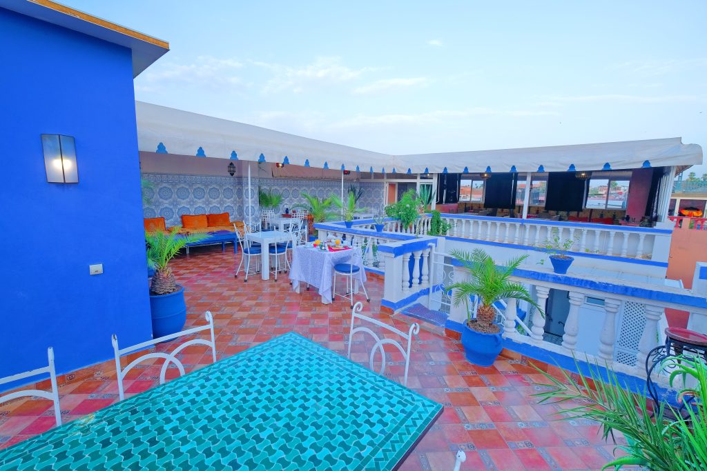 De la terrasse , on peut admirer toute la médina de Marrakech ainsi que la Koutoubia. En hiver on peut prendre son petit déjeuner face aux montagnes de l'Atlas enneigé