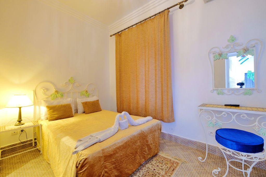 Cette chambre vous offre un style raffiné dispose d’un grand lit et d’un lit simple , un petit salon ,Son décor purement traditionnel dégageant chaleur et simplicité ,